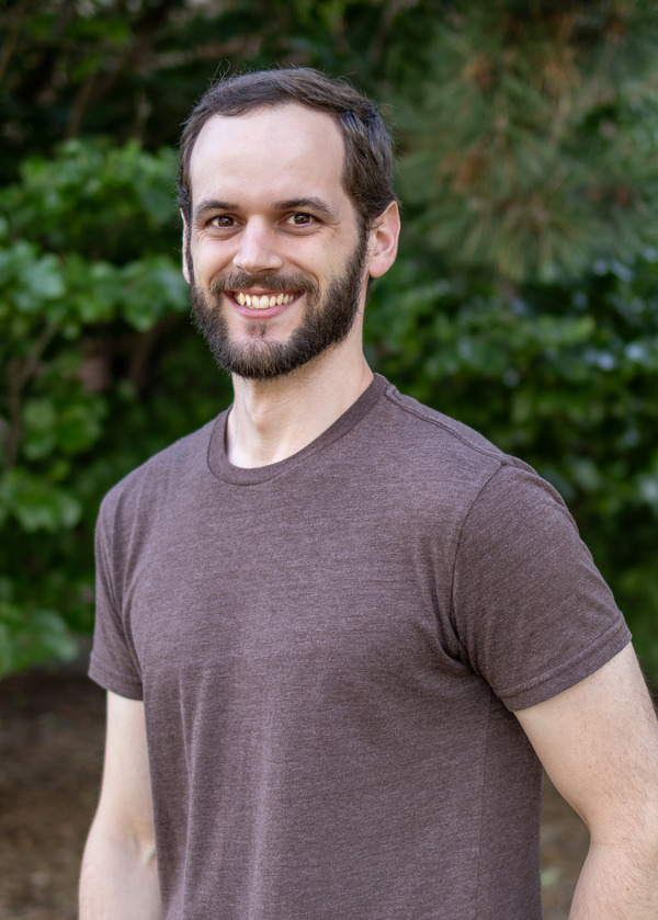 Troy Burtchett smiles at the camera. He is wearing a brown tshirt and has a beard and moustache. He is standing in front of evergreen trees.